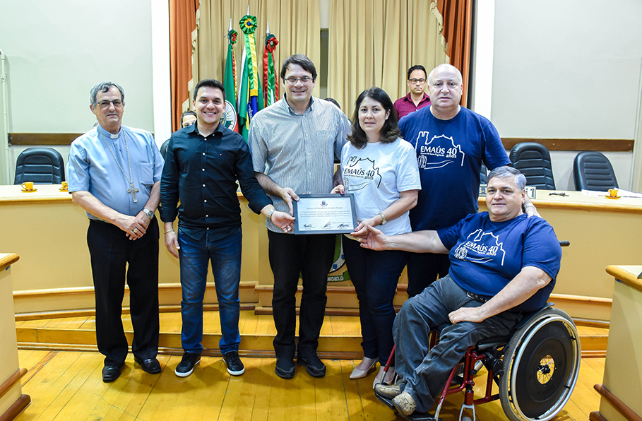 Proposta pelo vereador Vinícius Makvitz (MDB) e subscrita pelo vereador Rodrigo Trevisan (Progressistas), a homenagem contou com a presença do Chefe de Gabinete do prefeito Jacques Barbosa, Airton Peruzzi, representando o Poder Executivo de Santo Ângelo; Bispo Dom Liro Vendelino Meurer, de José Luís e Claudia Moscon, Casal presidente do Emaús Santo Ângelo, e dos padres Euclides Benedetti e Inácio Dalla Nora.