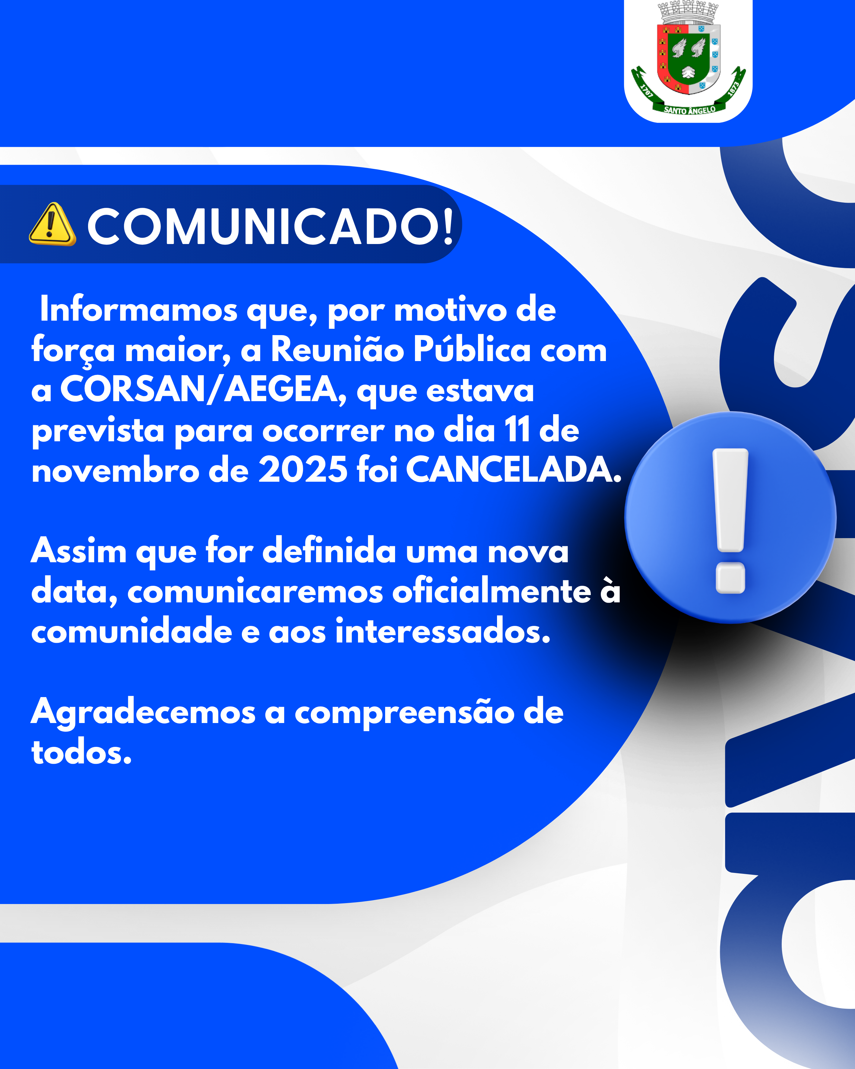 Informamos que, por motivo de força maior, a Reunião Pública com a CORSAN/AEGEA, que estava prevista para ocorrer no dia 11 de novembro de 2025 foi cancelada.