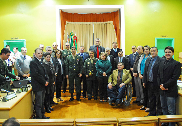 A solenidade contou, ainda, com a presença da Banda do 1º BCom, que abrilhantou a sessão ao executar o Hino Nacional e o Hino da Independência. A Mesa de Honra foi composta pelo presidente em exercício, Pedro Waszkiewicz; Vice-Prefeita, Nara Damião; Fábio Matielo, Juiz Diretor da Subseção Judiciária de Santo Ângelo; José Simões Machado, Diretor das Promotorias de Justiça de Santo Ângelo; Coronel Luiz Carlos Damasceno , Comandante do 1ºBCom e Chefe da Guarnição Militar Federal, Tenente Coronel Fernando Monteiro da Silva, Comandante da 10ª Circunscrição do Serviço Militar; Tenente Coronel Claiton Portilho, Comandante do CRPO Missões; Major Eglacir Chaves, Comandante do 11º Comando Regional de Bombeiros; Itaguaci Correa, Presidente da Subseção Local da OAB; Luiz Carlos Dallepiane, Presidente do Sindilojas.