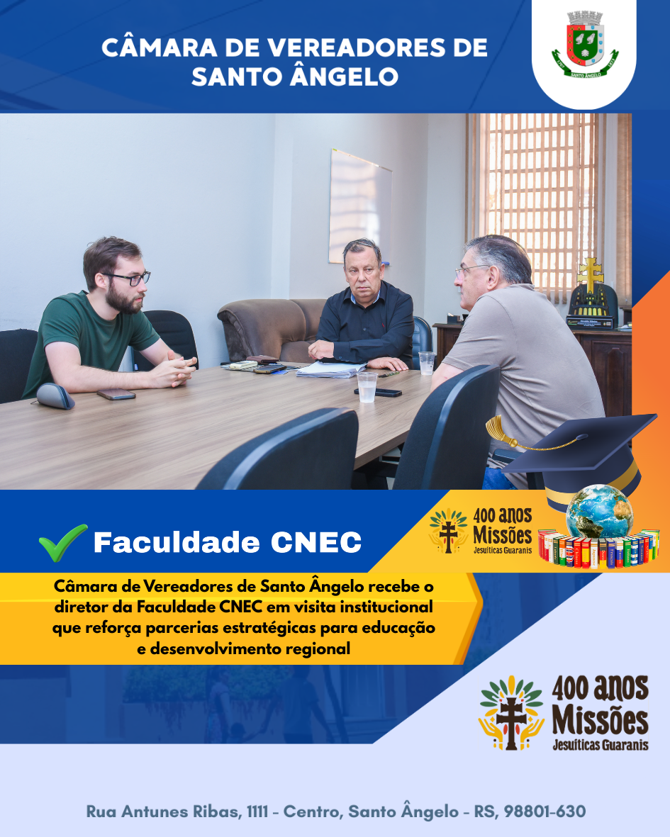 A visita de cortesia teve como objetivo aproximar ainda mais a instituição de ensino do Legislativo e do município. Daniel de Brum destacou que a Faculdade CNEC e o Colégio Sepé Tiaraju estão à disposição para parcerias que fortaleçam a educação e o desenvolvimento regional.