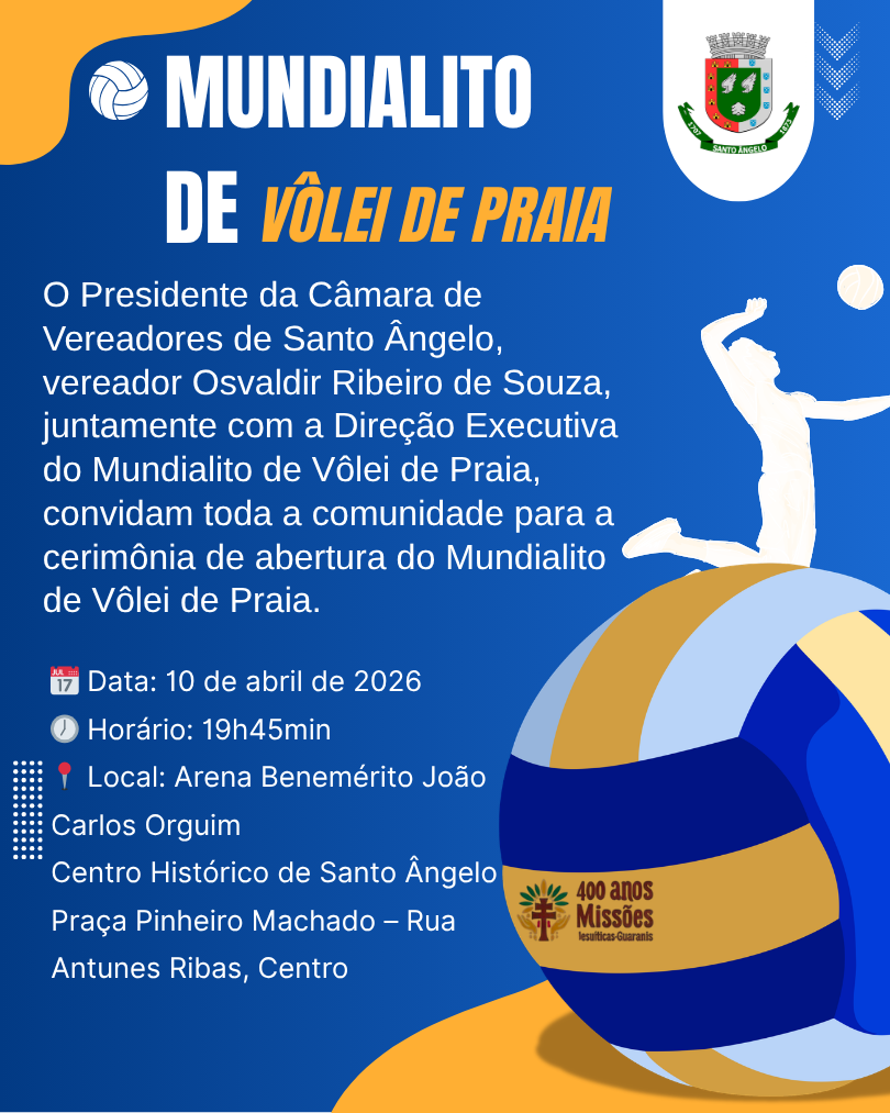 O Presidente da Câmara de Vereadores de Santo Ângelo, vereador Osvaldir Ribeiro de Souza, juntamente com a Direção Executiva do Mundialito de Vôlei de Praia têm a honra de convidar Vossa Senhoria para a Cerimônia de Abertura do Mundialito de Vôlei de Praia , o maior evento da América Latina, integrando a programação alusiva aos 400 anos das Missões.