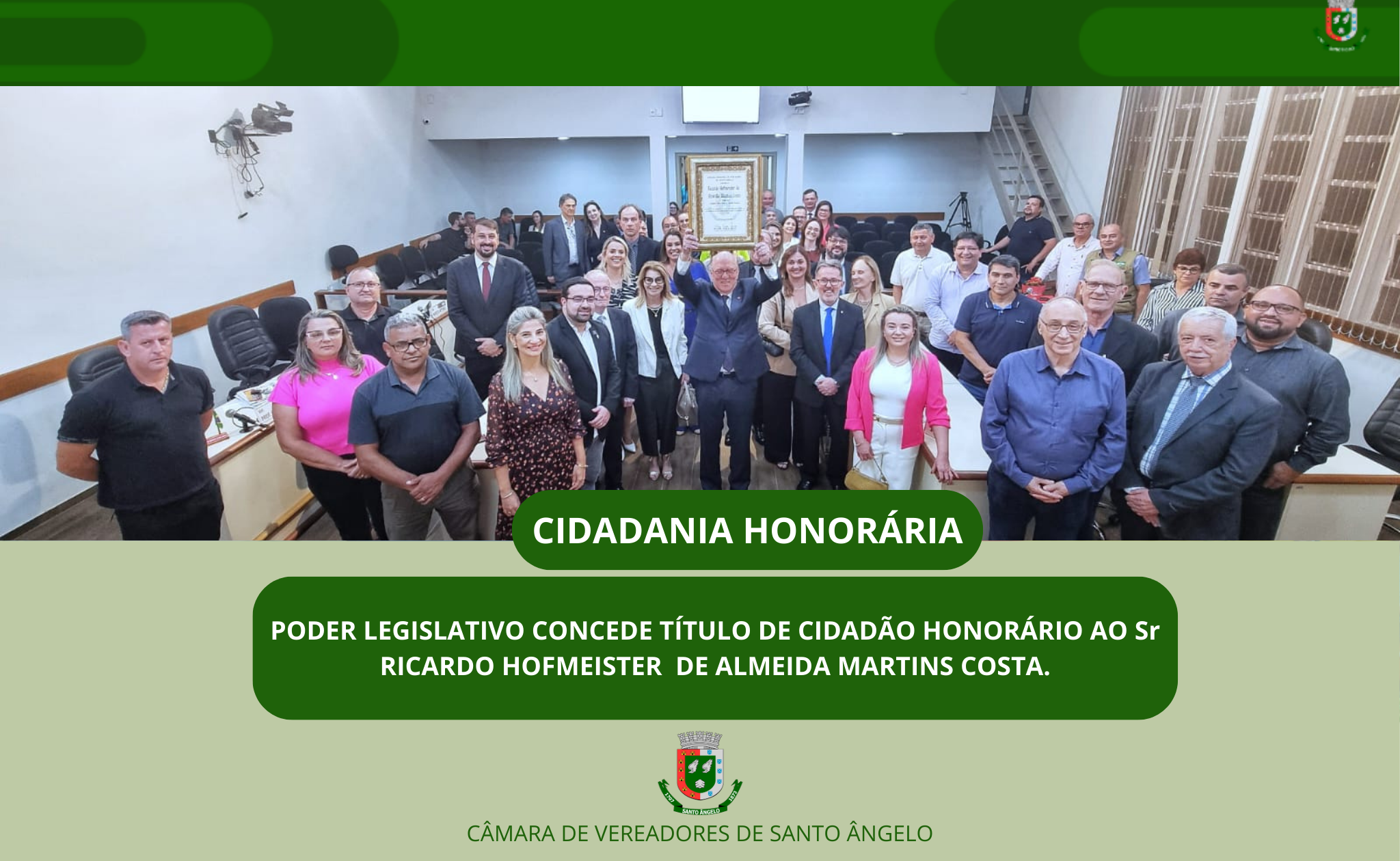 Na última Segunda-Feira, 02, após sessão ordinária, a Câmara de vereadores, em sessão solene, fez a entrega do título de Cidadão Honorário do Município de Santo Ângelo ao  Desembargador Ricardo Hofmeister de Almeida Martins Costa, Presidente do Tribunal Regional do Trabalho da 4ª Região.
