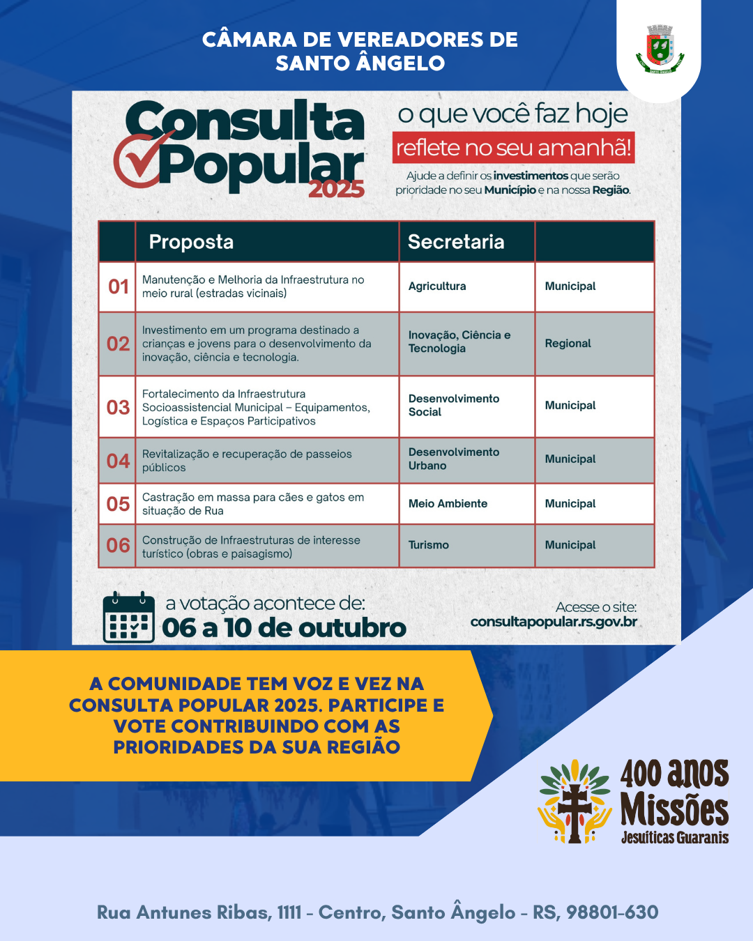 A votação acontece de 6 a 10 de outubro e é indispensável apresentar o título de eleitor. Os votos poderão ser registrados em pontos fixos e estratégicos nos municípios e também pela internet, no site consultapopular.rs.gov.br.. O prazo encerra cinco minutos antes da meia-noite do dia 10 de outubro. A Câmara de Vereadores de Santo Ângelo convida toda a comunidade a participar da Consulta Popular, ressaltando que as áreas contempladas são de extrema relevância para o desenvolvimento do município e que, atingindo o mínimo de 2% de votantes, Santo Ângelo estará apta a receber os recursos destinados à região.