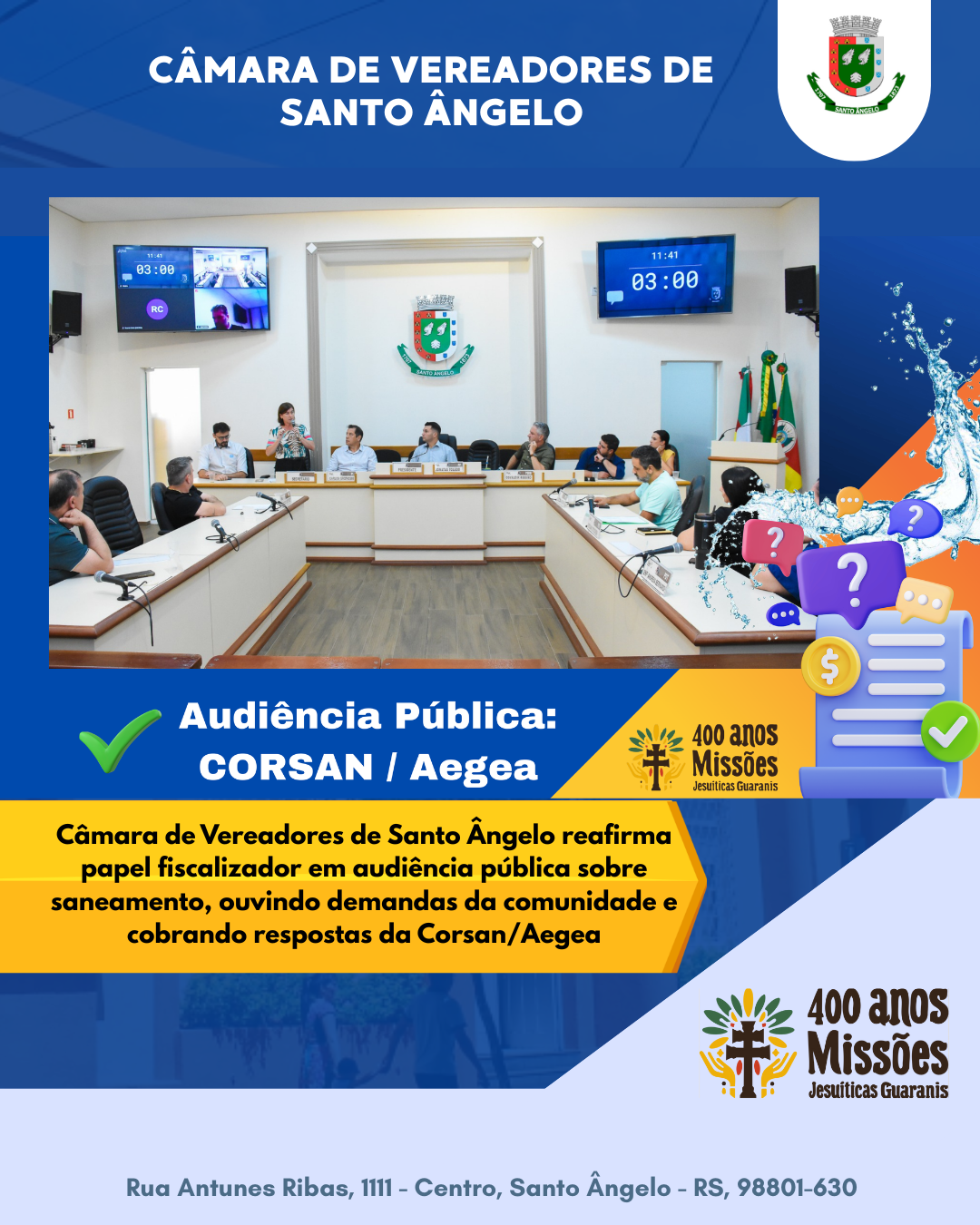 Na manhã desta sexta-feira, 20, o plenário da Câmara de Vereadores de Santo Ângelo recebeu uma audiência pública que reuniu autoridades, representantes de entidades e a comunidade para tratar da qualidade dos serviços de saneamento prestados pela Corsan/Aegea. A iniciativa foi proposta pelo vereador Jonatas Dutra Toledo, que ressaltou a importância de ouvir os moradores, esclarecer dúvidas e cobrar explicações diante das constantes reclamações relacionadas ao abastecimento de água e ao esgotamento sanitário.
