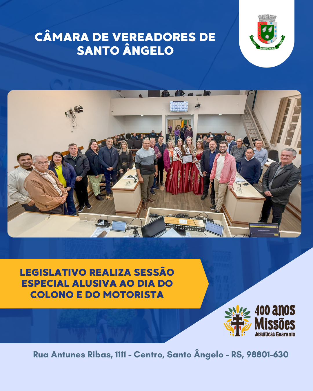 Na noite de segunda-feira, 21, o Plenário da Câmara Municipal de Santo Ângelo foi palco de uma sessão especial marcada pela emoção e pelo reconhecimento. A ocasião celebrou o Dia do Colono e do Motorista, que será oficialmente comemorado em 25 de julho, e teve como proponente o vereador André Silva, do MDB, que trouxe à pauta a valorização de trabalhadores essenciais para o desenvolvimento da cidade.