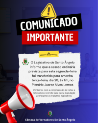 26 de outubro de 2025 Em virtude do feriado do servidor público sessão ordinária será realizada terça-feira 28 às 17h no Plenário Municipal