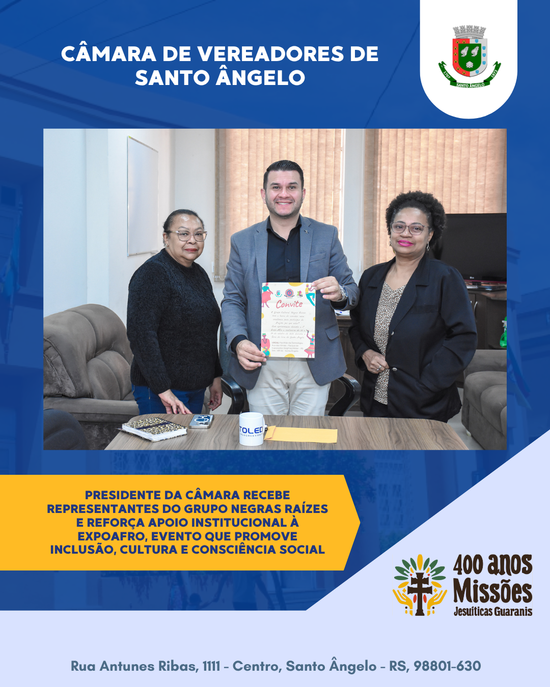 Durante a visita, as representantes do grupo entregaram ao presidente um convite especial, estendido a todos os vereadores, para participarem das atividades da ExpoAfro, que ocorrerá de 22 a 29 de outubro no Parque de Exposições Siegfried Ritter, em paralelo à Feira do Livro de Santo Ângelo. A ExpoAfro é um espaço de valorização da cultura afro-brasileira, da educação e da luta por igualdade. Os visitantes poderão conhecer os trabalhos realizados ao longo do ano nas escolas municipais, com foco em temas como consciência negra, combate à violência, enfrentamento ao preconceito e à discriminação. O lema deste ano, “Por que calar?”, convida à reflexão sobre o silêncio diante das injustiças e à importância de dar voz à diversidade.