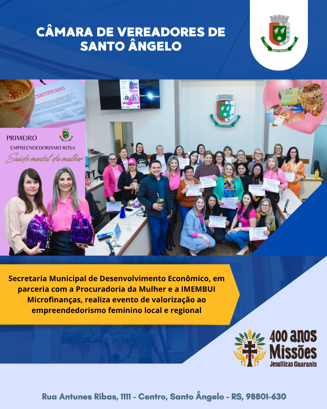 Na tarde da última quarta-feira, 29, a Câmara de Vereadores de Santo Ângelo foi palco da primeira edição do Empreendedorismo Rosa — uma iniciativa da Secretaria Municipal de Desenvolvimento Econômico, realizada em parceria com a Procuradoria da Mulher da Câmara e a instituição financeira IMEMBUI Microfinanças. O evento reuniu 18 mulheres empreendedoras da cidade e da região, que trouxeram ao Legislativo seus produtos, serviços e histórias de superação.