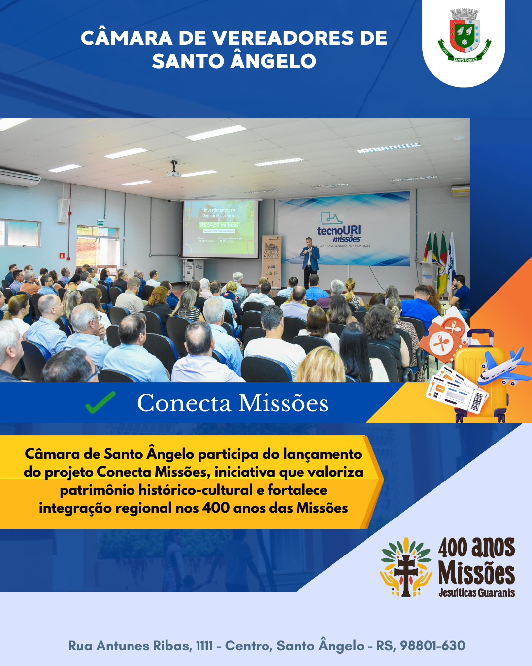 Segundo o presidente da Câmara de Vereadores, Osvaldir Ribeiro, o projeto representa uma oportunidade concreta de fortalecimento da economia local e regional. “O Conecta Missões é mais do que uma celebração histórica. Ele abre caminhos para a geração de emprego e renda, fomenta o turismo e valoriza a nossa identidade missioneira. Santo Ângelo e toda a região ganham com iniciativas que unem memória e futuro, trazendo desenvolvimento e reconhecimento para nossa história”, afirmou.