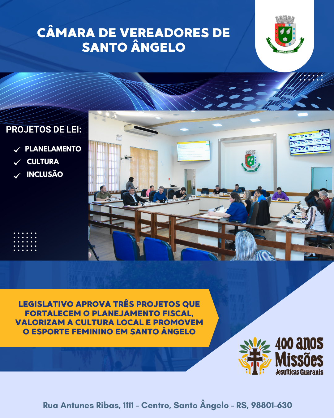 A Câmara de Vereadores segue atuando com responsabilidade e sensibilidade, promovendo ações que refletem os anseios da comunidade e fortalecem os pilares que sustentam o desenvolvimento humano e coletivo de Santo Ângelo.