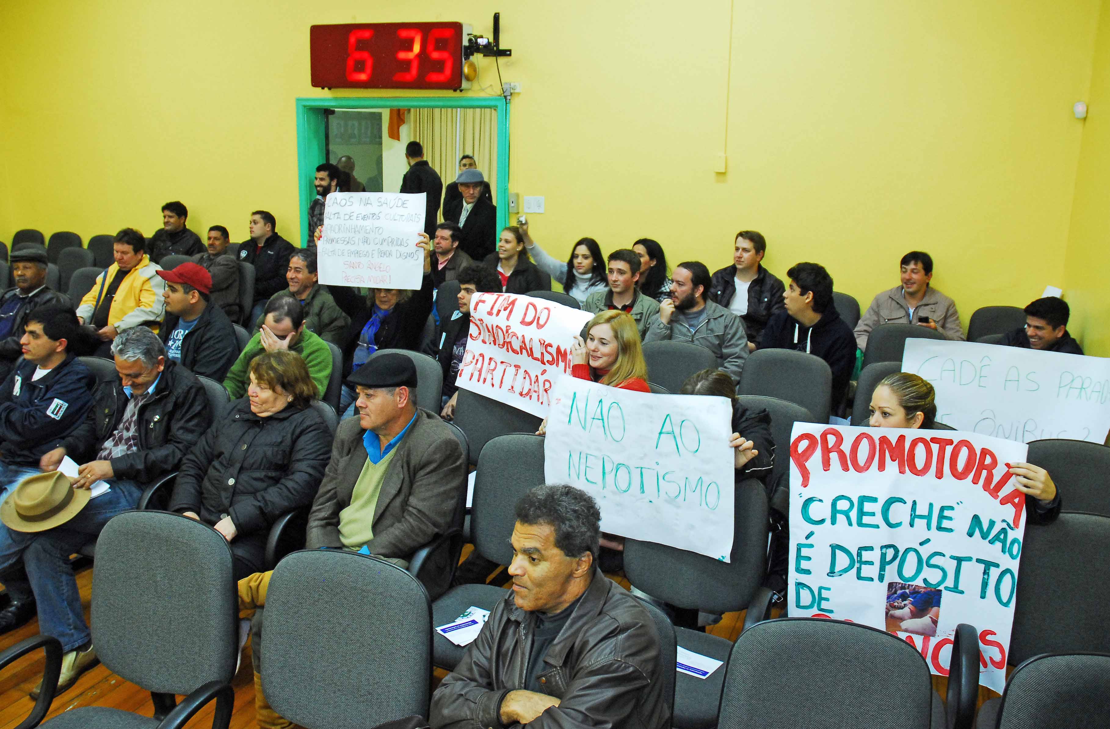 Um pequeno grupo de manifestantes esteve acompanhando a sessão ordinária do Legislativo Municipal nesta semana, dia 24. Nos cartazes, pedidos por providências nas áreas da saúde, educação e transporte.