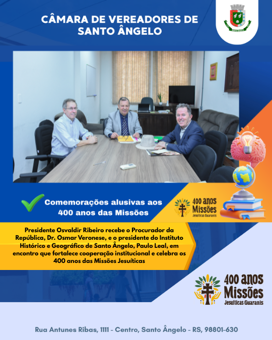 Esse encontro simboliza não apenas a aproximação institucional, mas também o compromisso da Câmara de Vereadores, sob a presidência de Osvaldir Ribeiro, em apoiar iniciativas que fortalecem a história e a cultura missioneira, reafirmando o papel do Legislativo como guardião da memória coletiva e parceiro ativo da comunidade.